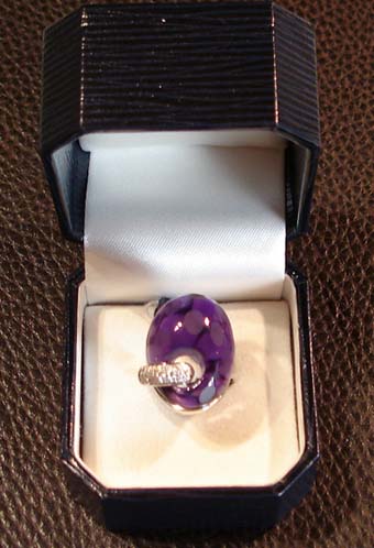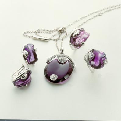 Ensemble bague, pendentif, boucles d'oreille améthystes pavés brillants.