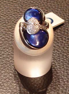Pendentif assorti à la bague, nacre bleue, or gris pavé diamants.