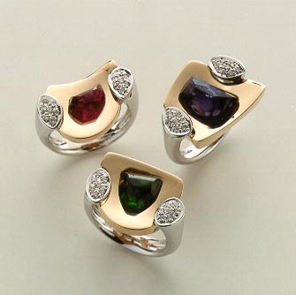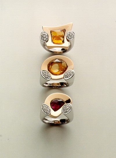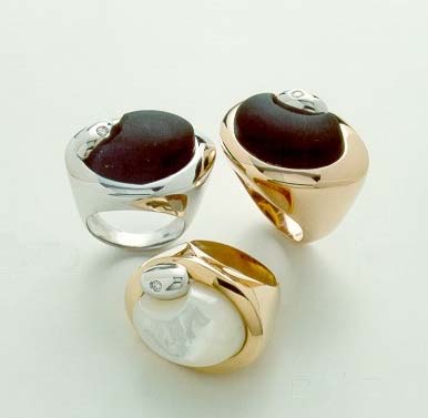 3 bagues or identiques, finition : or gris onyx brossé diamants ou finition or rouge onyx brossé diamants et finition or rouge nacre et diamants sertis sur or gris.