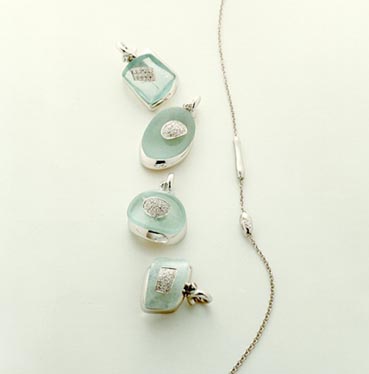 Pendentifs aigue-marine, différentes tailles, pavés diamants (possibilité de réaliser avec différents or, pierres et couleurs).