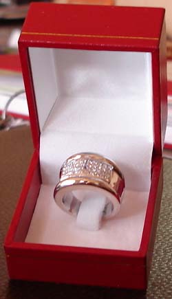 bague or gris pavée de brillants, taille princesse, sertie invisible.