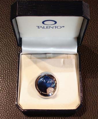 Pendentif assorti à la bague, nacre bleue, or gris pavé diamants.