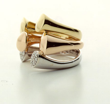 3 bagues or identiques, finition : or gris onyx brossé diamants ou finition or rouge onyx brossé diamants et finition or rouge nacre et diamants sertis sur or gris.
