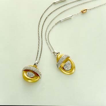 Différentes formes de pendentifs et de finition en bicolore, pavés diamants.